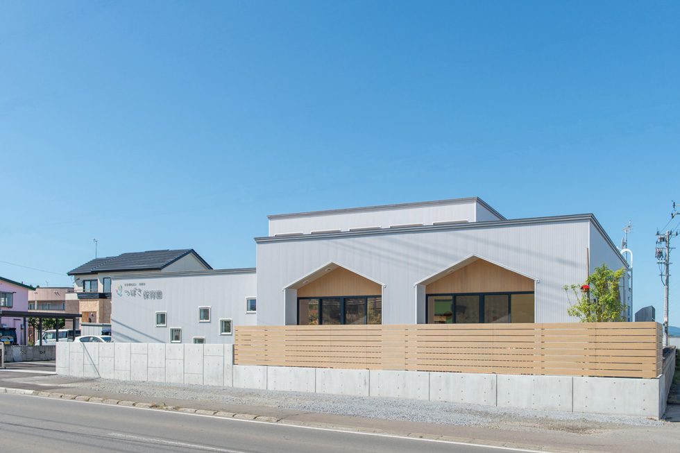 青森市の郊外に立地する保育園。冬季の積雪処理を考慮して無落雪屋根としましたが、外観が単調にならないように旧園舎の家型シルエットを内包したデザインとしました。家型の外壁には青森県産のヒバ天然木を使用しています。また、高窓により冬季間も採光を得られるように窓の高さを工夫し、明るく空の様子を感じられる遊戯室となっています。さらに、内部の床には裸足に優しい青森県産のパインフローリングを使用し、遊戯室を中心に配置された保育室は勾配天井で落ち着ける雰囲気としています。