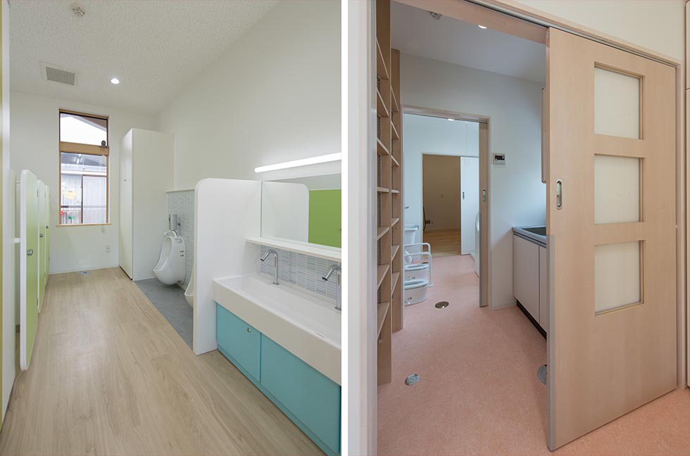 左)トイレ、右)調乳室から続く沐浴室