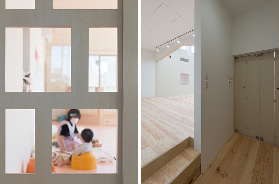 保育室の小窓より玄関を望む